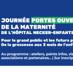 La maternité de l’hôpital Necker-Enfants malades organise le jeudi 2 octobre 2025, de 10h à 16h30, une journée portes ouvertes pour le grand public et les futurs parents, de la grossesse aux 3 mois de l’enfant. Au programme : Visites du bloc (inscriptions spécifiques ici) Ateliers et points infos : allaitement, biberon, diététique et grossesse, […]